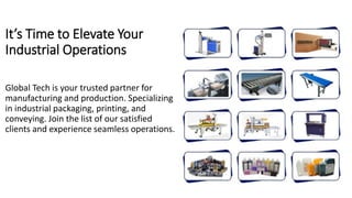 Global Tech provides industrial solutions and services in Karachi, Pakistan, specializing in manufacturing, packaging, printing, and conveying. Their offerings include various machines for packaging, printing, and end-line conveying tailored to improve operational efficiency. Clients can contact them for more details on their services via phone or email.