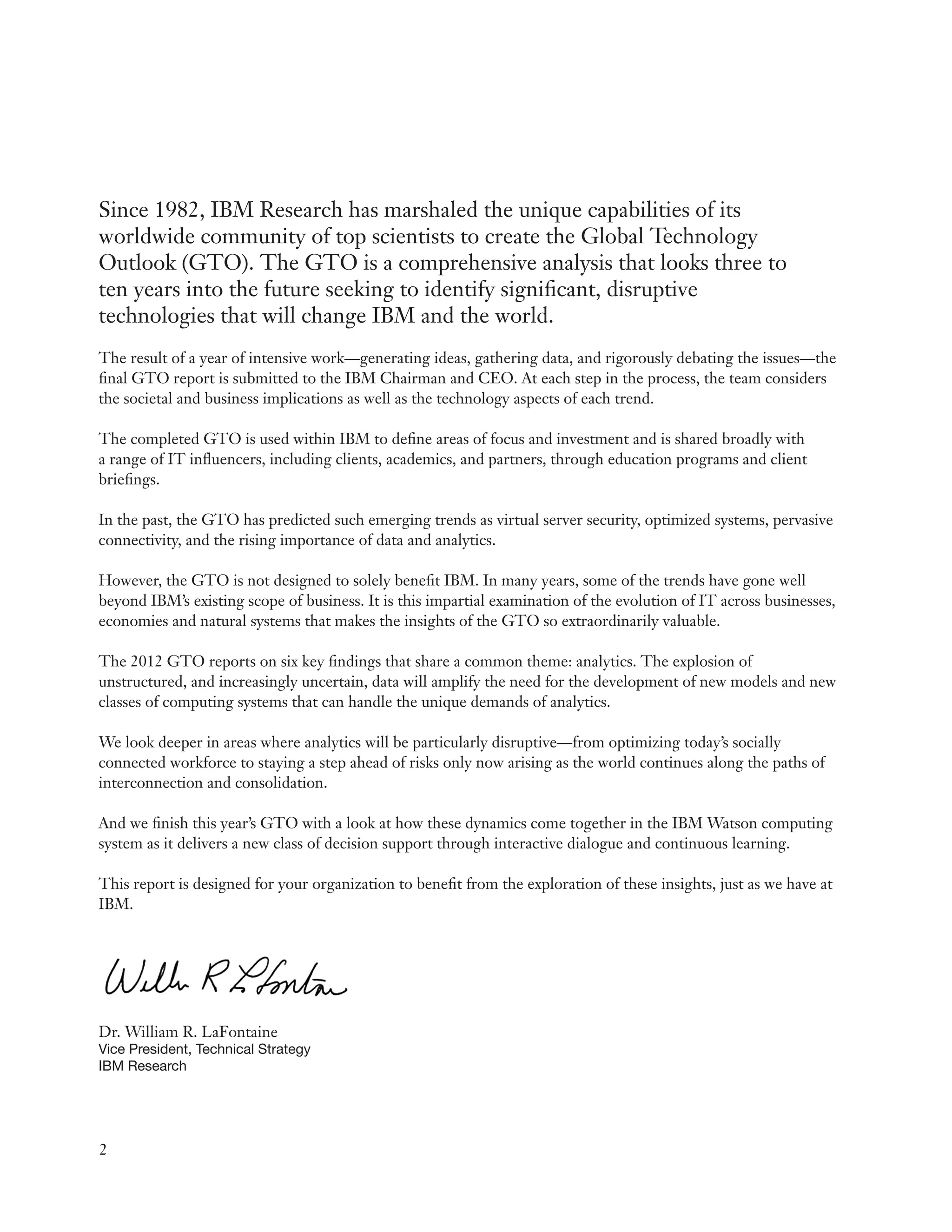 The IBM Research Global Technology Outlook (GTO) 2012 outlines six key findings centered on analytics and the management of uncertain data, emphasizing the need for new models and systems to handle the growing volume and complexity of data. It describes the evolution of business practices towards outcome-based models, resilient infrastructures, and the integration of analytics in decision-making processes, particularly in response to global challenges and emerging technologies. The report highlights the development of IBM Watson as a revolutionary platform that applies these insights through advanced artificial intelligence capabilities.