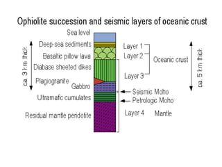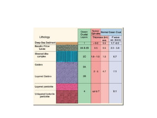 2) The continental crust averages 30 km thick and has a composition ranging from granodiorite to diorite. The oceanic crust is 6-7 km thick and composed of three layers: an upper volcanic layer, a middle intrusive gabbro layer, and a lower ultramafic layer.