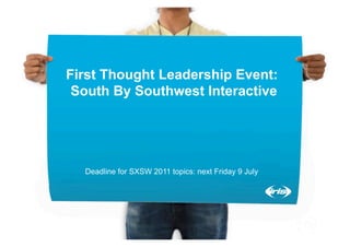 The document outlines the importance of participating in the South by Southwest (SXSW) Interactive festival, emphasizing opportunities for thought leadership and networking among creative professionals. It suggests submitting engaging panel topics, innovative ideas, and social experiments to increase visibility and foster strategic partnerships. Additionally, it highlights the necessity of sharing content across social platforms to enhance personal and organizational profiles, using examples like Zappos to illustrate effective content marketing strategies.