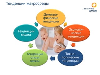Документ представляет собой отчет о тенденциях на детском рынке в России, основанный на макроэкономических, демографических и технологических факторах. В нем рассматривается рост рождаемости, изменение потребительских привычек семей с детьми и влияние цифровых технологий на воспитание нового поколения. Также упоминаются экономические прогнозы и ожидаемые изменения в родительских расходах на детские товары в 2015 году.