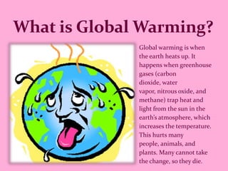 Global warming is caused by greenhouse gases trapping heat in the atmosphere. This is similar to how a car gets hotter in the sun with the windows closed. Increased greenhouse gases are dangerous because they will continue to raise temperatures and cause harm to people, animals and plants. Cutting down trees also exacerbates global warming because trees absorb carbon dioxide. Electricity production through burning fossil fuels additionally contributes to global warming by releasing pollutants into the air.