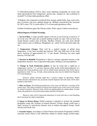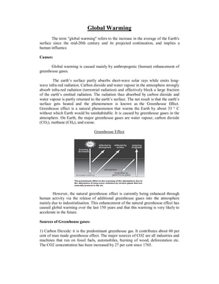 Global warming refers to the increase in average temperatures on Earth since the mid-20th century, mainly caused by human emissions of greenhouse gases like carbon dioxide and methane from industrialization. This enhances the natural greenhouse effect and is accelerating global temperature rise. Impacts include rising sea levels threatening coastal cities, changes in weather patterns and food production, and increased tropical diseases. Efforts to prevent further warming involve reducing greenhouse gas emissions and developing alternative energy sources.
