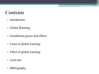 Global warming occurs when greenhouse gases like carbon dioxide and methane trap heat in the atmosphere, causing the planet to warm up. This is harmful because many plants and animals cannot adapt to the temperature changes and die off. The primary causes of global warming are human activities like burning fossil fuels, which release greenhouse gases into the air. Effects of global warming include rising sea levels from melting ice caps that can flood island communities, more severe weather events, and destruction of forests by fires and acid rain. While major changes need to be made by governments and industry, small individual actions like conserving energy can also help address the problem.