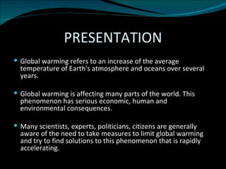 This document discusses global warming, its causes and consequences. It notes that global warming refers to the rise in average temperatures of the Earth's atmosphere and oceans over time. The phenomenon is affecting many parts of the world and has serious economic, human and environmental impacts. The document lists some consequences of global warming such as rising sea levels and the spread of disease.