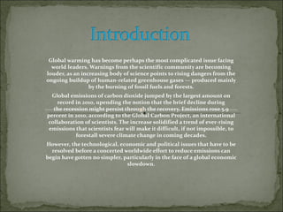 Global warming has become a major issue facing world leaders as warnings from scientists about rising dangers from greenhouse gases have increased. Global carbon emissions jumped by the largest amount on record in 2010, worsening the problem. However, resolving the technological, economic, and political issues to enact a worldwide effort to reduce emissions has proven difficult, particularly with economic slowdowns. The UN has sponsored annual climate talks for two decades but they have often ended in disappointment with little real impact on the climate despite incremental political agreements. Green building techniques that focus on energy efficiency, materials selection, and renewable energy can help address global warming issues.