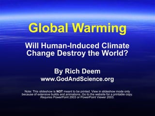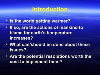 This document discusses global warming and its potential causes and consequences. It begins with an introduction that asks whether the world is getting warmer, if human actions are responsible, and what can be done about it. It then covers the history of Earth's climate over billions of years, influenced by factors like the sun's energy output, lifeforms, and orbital variations. Recent temperature changes are examined, showing a general warming trend over the last century. Potential consequences of further warming discussed include rising sea levels, stronger hurricanes, effects on wildlife and humans. The document considers a range of perspectives on both natural and human influences on the climate.