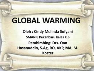 Dokumen tersebut membahas tentang global warming, yang dijelaskan sebagai peningkatan suhu rata-rata bumi akibat meningkatnya gas rumah kaca dari aktivitas manusia. Penyebab utama global warming adalah efek rumah kaca, efek umpan balik, peningkatan pupuk kimia, dan deforestasi. Dampaknya meliputi kenaikan permukaan air laut, topan yang lebih parah, gagal panen, kepunahan spesies, dan perubahan iklim