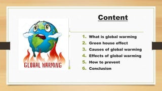 The document discusses global warming, defining it as the increase in average temperatures of the Earth's surface over the last century due to greenhouse gas emissions from human activities like burning fossil fuels and deforestation. This greenhouse effect occurs when gases like carbon dioxide trap heat in the atmosphere that would otherwise escape into space. The effects of global warming include rising sea levels, changing weather patterns, spreading diseases, and threats to ecosystems. To prevent further global warming, the document recommends reducing fossil fuel use, developing renewable energies, using efficient vehicles and devices, and sustainably managing forests and agriculture.
