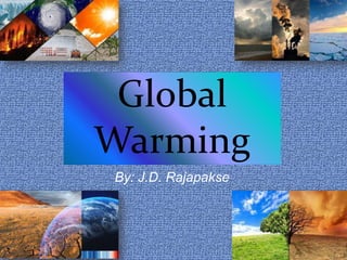 Global warming refers to the long-term rise in Earth's temperatures caused by increased greenhouse gas emissions from human activities like burning fossil fuels. It was first predicted in 1896 by Swedish scientist Svante Arrhenius and the effects of increased carbon dioxide on global warming were connected by Guy Callendar in 1938. Global warming can have serious effects like rising sea levels that cause loss of coastal land, changes in weather patterns leading to more extreme events like droughts and floods, and threats to biodiversity and human health from impacts to air and water quality and the spread of diseases. Individual actions like changing light bulbs, driving less, recycling more, and adjusting thermostats can help reduce the effects of global warming.