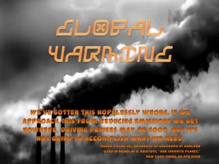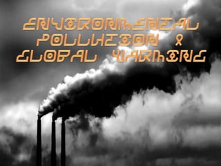 This document discusses different types of environmental pollution and their causes and effects, as well as solutions. It covers three main types of pollution: land, water, and air pollution. Land pollution stems from waste disposal, pesticides, mining, and urbanization. Water pollution comes from waste water, agriculture, oil, and river dumping. Air pollution is caused by vehicle and factory emissions, wildfires, and warfare. Global warming and the greenhouse effect are explained, noting the gases involved and consequences like rising temperatures, extreme weather, and habitat damage. Individual actions to reduce pollution and global warming are suggested like using less energy and driving less.