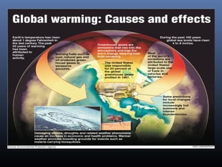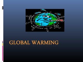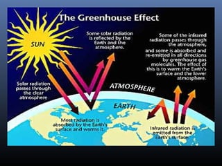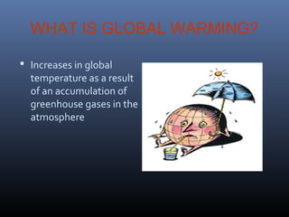 This document defines and explains global warming, greenhouse gases, and the greenhouse effect. It states that global warming is caused by an accumulation of greenhouse gases like carbon dioxide and methane in the atmosphere from human activities like burning fossil fuels and deforestation. This traps heat from the sun and warms the planet. The effects of global warming include rising sea levels, more extreme weather, species extinction, and changes to ecosystems. Ways to reduce greenhouse gas emissions and mitigate global warming are also presented, such as using less fossil fuels, alternative energy sources, and planting trees.