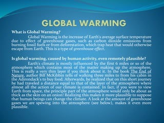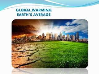 Global warming is the increase of Earth's average surface temperature due to greenhouse gases like carbon dioxide trapping heat that would otherwise escape. Earth's climate is influenced by the thin atmosphere layer containing most air. While thin, human emissions make it plausible we can impact climate. Significant greenhouse gases include water vapor and carbon dioxide, which has internal vibrational modes that absorb and re-emit infrared radiation. Carbon dioxide remains in the atmosphere for hundreds of years, acting as a controlling factor rather than reacting one. Human emissions have increased atmospheric carbon dioxide by 30% correlating with fossil fuel use, with future projections showing levels not seen in 50 million years posing serious negative effects.