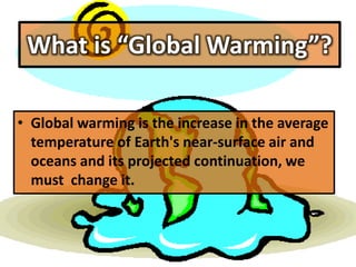 Global warming refers to the long-term rise in the average temperature of the Earth's climate system. The effects include a rise in average global temperatures, especially affecting the Arctic region, and a rise in sea levels. Unless addressed, the consequences will include changes to weather patterns, threats to human and wildlife health, and melting of glaciers and ice sheets. The greenhouse effect, caused by gases that trap heat in the lower atmosphere, is the underlying process of global warming. Solutions require immediate action to reduce pollution and protect the planet for future generations.