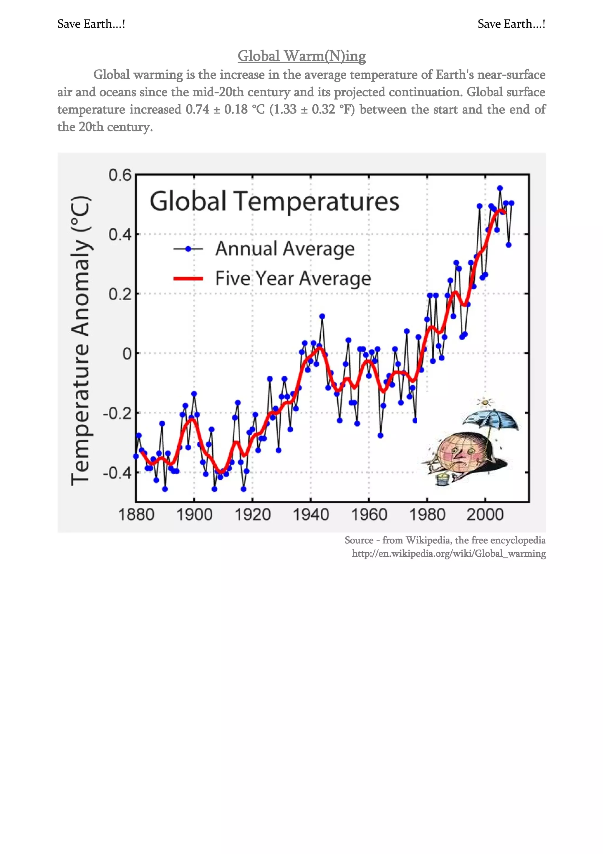Global warming refers to the increase in average surface temperatures of the Earth since the late 19th century, according to scientific consensus. The document then lists specific human behaviors and activities that contribute to greenhouse gas emissions and global warming, such as using excess paper and electricity, driving inefficient vehicles, eating meat, and deforestation. It encourages individuals to make small changes like using less hot water, unplugging appliances, and encouraging organizations to reduce emissions in order to help address the problem of global warming from a grassroots level.