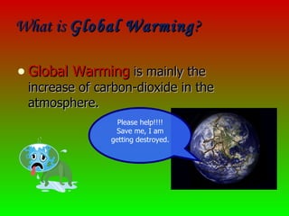 Global warming is caused by human activities like driving cars and using electricity which release greenhouse gases like carbon dioxide into the atmosphere. As the planet warms, some areas will experience more severe droughts and heat waves while sea levels will rise from melting ice caps. To help address global warming, individuals can carpool, take public transportation, turn off electronics when not in use, and bike or walk for short trips to reduce their carbon footprint.