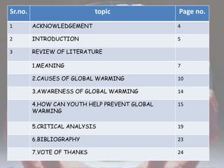 The document discusses the causes and effects of global warming. It notes that global warming is caused by increasing greenhouse gas emissions from human activities like burning fossil fuels. If left unaddressed, global warming will have severe consequences by 2050, including the spread of diseases, more frequent and intense hurricanes and droughts, economic damage, and rising sea levels from melting polar ice caps that could displace millions of people. Youth are urged to take actions like using renewable energy, driving electric vehicles, planting trees, and conserving energy to help prevent the worst impacts of global warming.