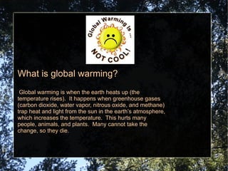 Global warming is caused by greenhouse gases trapping heat in the atmosphere, causing the Earth's temperature to rise. This warming harms many plants and animals by changing their environments. Some signs of global warming include rising sea levels submerging islands, killing coral reefs and algae in oceans, and more severe wildfires destroying forests. The primary cause of increased greenhouse gases is human activities like burning fossil fuels for energy and transportation, cutting down trees, and producing garbage. To reduce global warming, people are taking actions like carpooling, conserving energy, planting trees, and reducing waste.