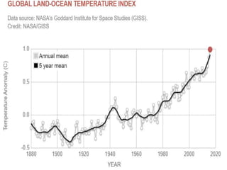 Global warming refers to the increase in the Earth's average surface temperature due to greenhouse gas emissions. The planet's average surface temperature has risen about 2 degrees Fahrenheit since the late 19th century, and the oceans have warmed by 0.3 degrees over this period as well. Other evidence of global warming includes shrinking ice sheets, rising sea levels, and declining Arctic sea ice. The main causes of global warming are greenhouse gas emissions from human activities like burning fossil fuels, population growth, and deforestation. If unchecked, global warming will lead to more extreme weather, rising sea levels, longer growing seasons and changes in precipitation patterns. Solutions proposed to address global warming include reducing greenhouse gas emissions, stopping deforestation, and count