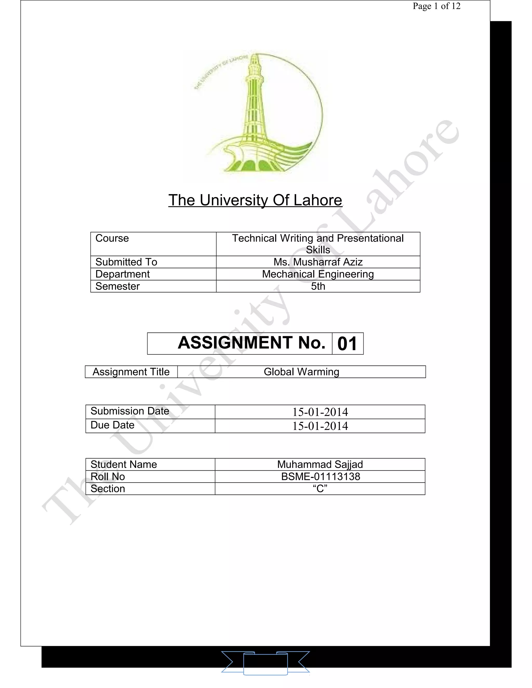 The document is a student assignment on global warming. It discusses the causes and effects of global warming, including how human activity like burning fossil fuels is overloading the atmosphere with carbon dioxide and trapping heat. It reviews literature from experts acknowledging the threat of climate change. The assignment analyzes ways to control global warming like reducing energy and fossil fuel use and planting trees. It concludes that while individual efforts may seem small, collective action is needed and successes should be celebrated.