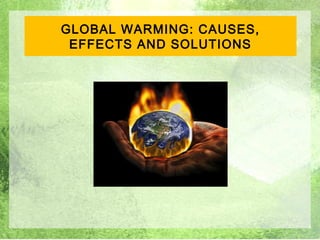 Global warming is caused by increased emissions of greenhouse gases from human activities like burning fossil fuels and deforestation. As greenhouse gases accumulate in the atmosphere, they trap heat and cause global temperatures to rise. This warming leads to changes in climate patterns and impacts like rising sea levels, stronger storms, more wildfires, and disruption of animal and plant habitats. Solutions include transitioning to renewable energy, improving energy efficiency, sustainable forest management, and developing new low-carbon technologies.