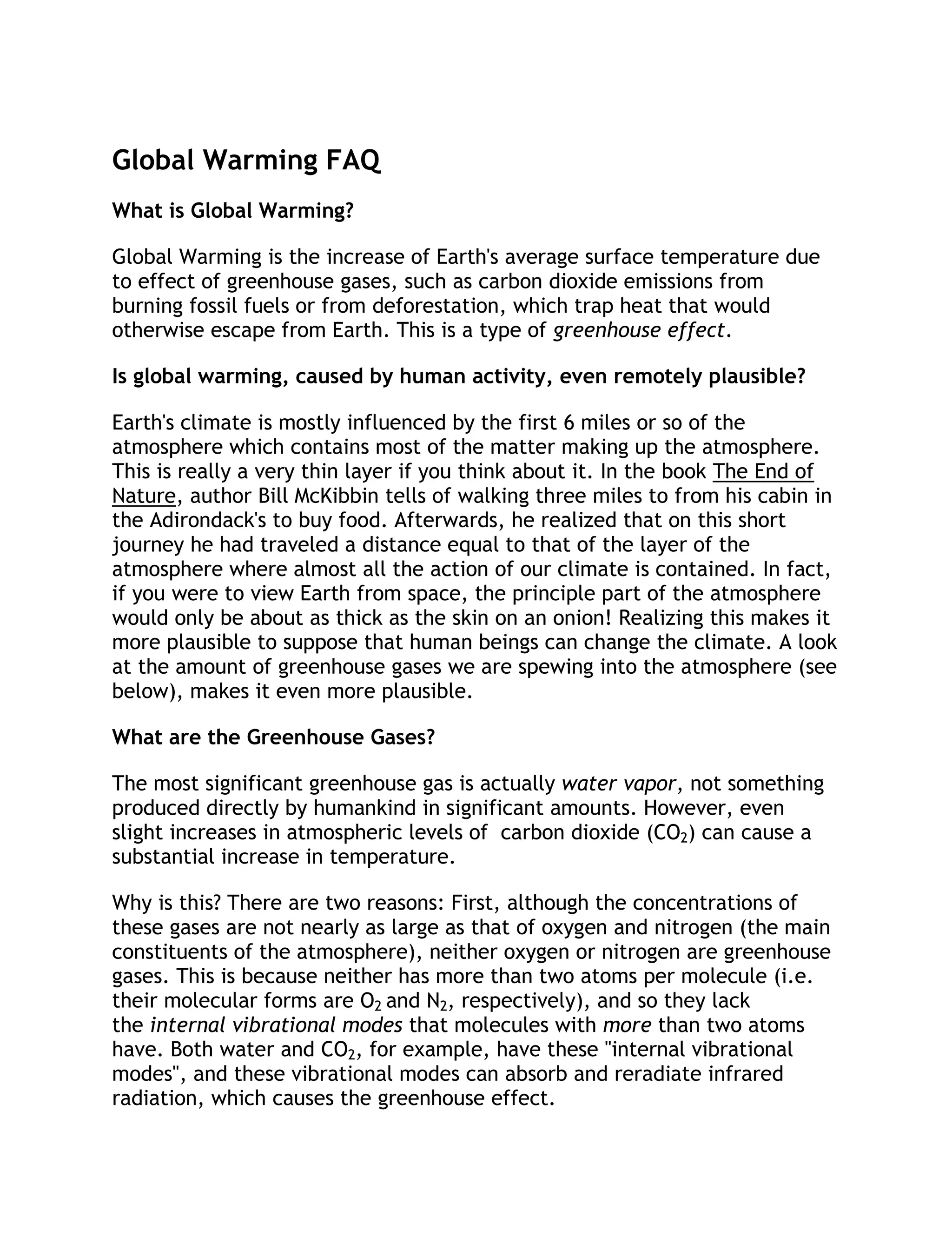 1) Global warming is caused by human emissions of greenhouse gases like carbon dioxide that trap heat in the atmosphere. The thin layer of atmosphere where climate occurs could be impacted by human activity.