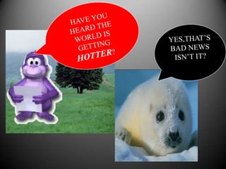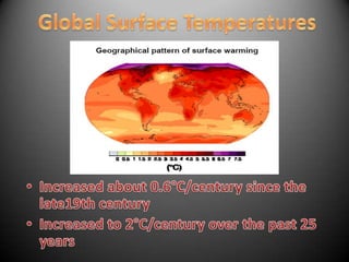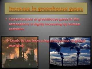 This document discusses the causes and impacts of global warming. It identifies the main causes as the burning of fossil fuels for power, transportation, and industrial processes, as well as emissions of greenhouse gases from agriculture, forestry, land use, and waste management. Some of the impacts mentioned include rising sea levels at a rate of 1-2 mm per year over the past century, threats to polar animals from loss of ice, and the non-uniform nature of global warming. The document calls for measures to control the problem of global warming and encourages environmentally friendly behavior.