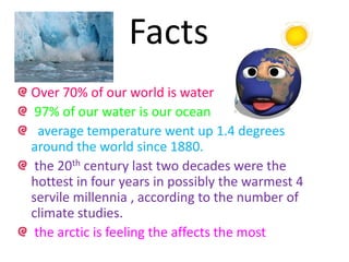 Over 70% of the Earth is covered in water, with 97% of that being ocean water. The average global temperature has risen 1.4 degrees Celsius since 1880, with the last two decades of the 20th century being the hottest in the past 4,000 years according to climate studies. The Arctic is experiencing the effects of climate change most severely, with warming temperatures threatening polar bears and penguins by reducing their habitats.