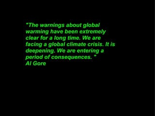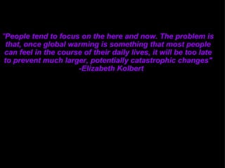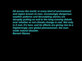 Global warming is causing increasingly dangerous weather patterns and devastating storms around the world, demonstrating that climate change is real. As Elizabeth Kolbert notes, by the time most people feel the effects of global warming in their daily lives, it will be too late to prevent larger, potentially catastrophic changes. Barack Obama states that man-made natural disasters are a frightening new phenomenon caused by climate change. Both Arnold Schwarzenegger and Al Gore argue that the warnings about global warming have been clear for a long time and that inaction will deepen the global climate crisis.