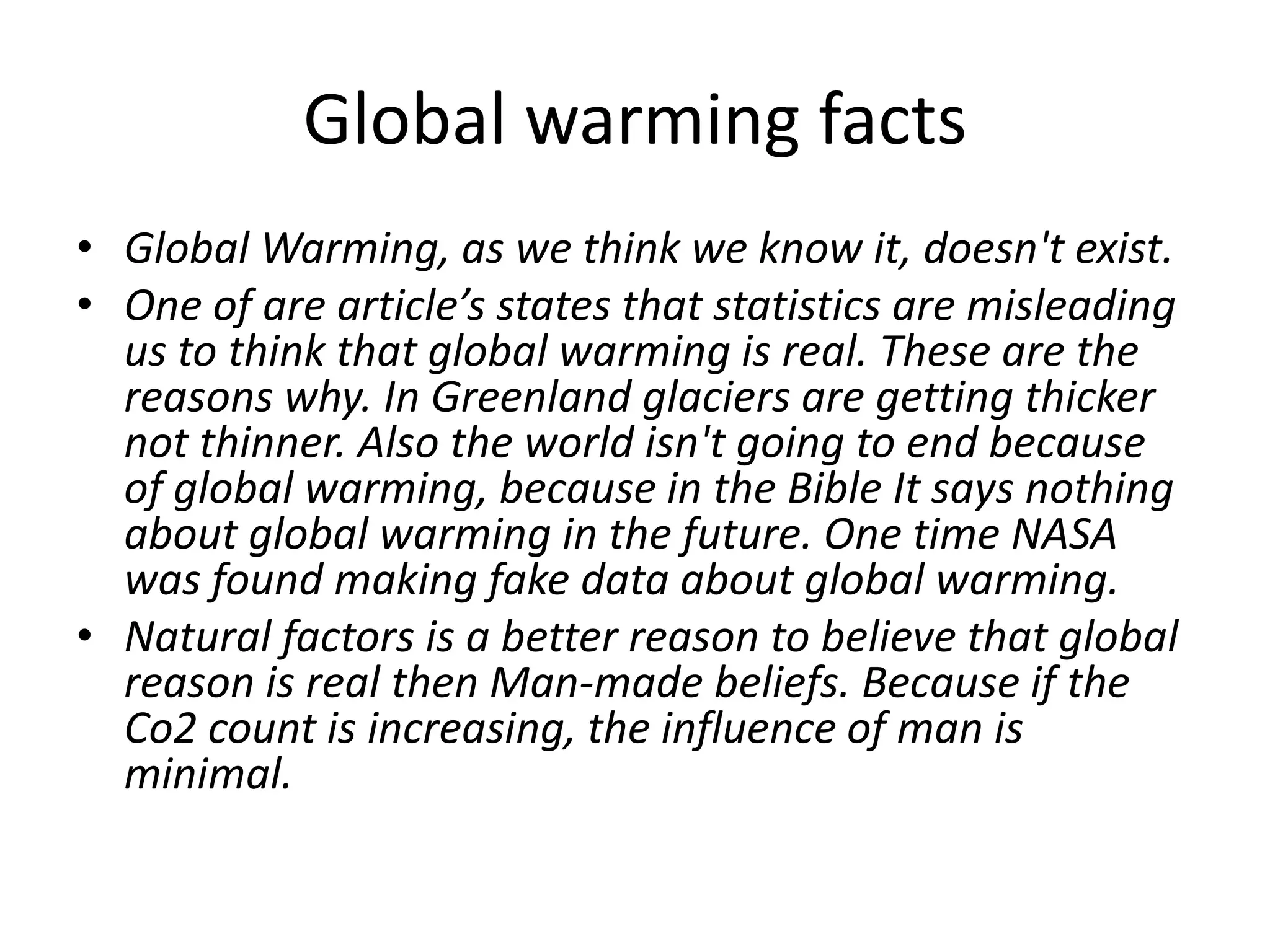 Global warming is not real according to the authors. They claim that statistics are misleading and that glaciers in Greenland are actually thickening, not shrinking. Natural factors are a better explanation than human causes, and that CO2 increases are due to minimal human influence. The authors also argue that reports of global warming are simply lies for personal financial gain by scientists, the government, and corporations.