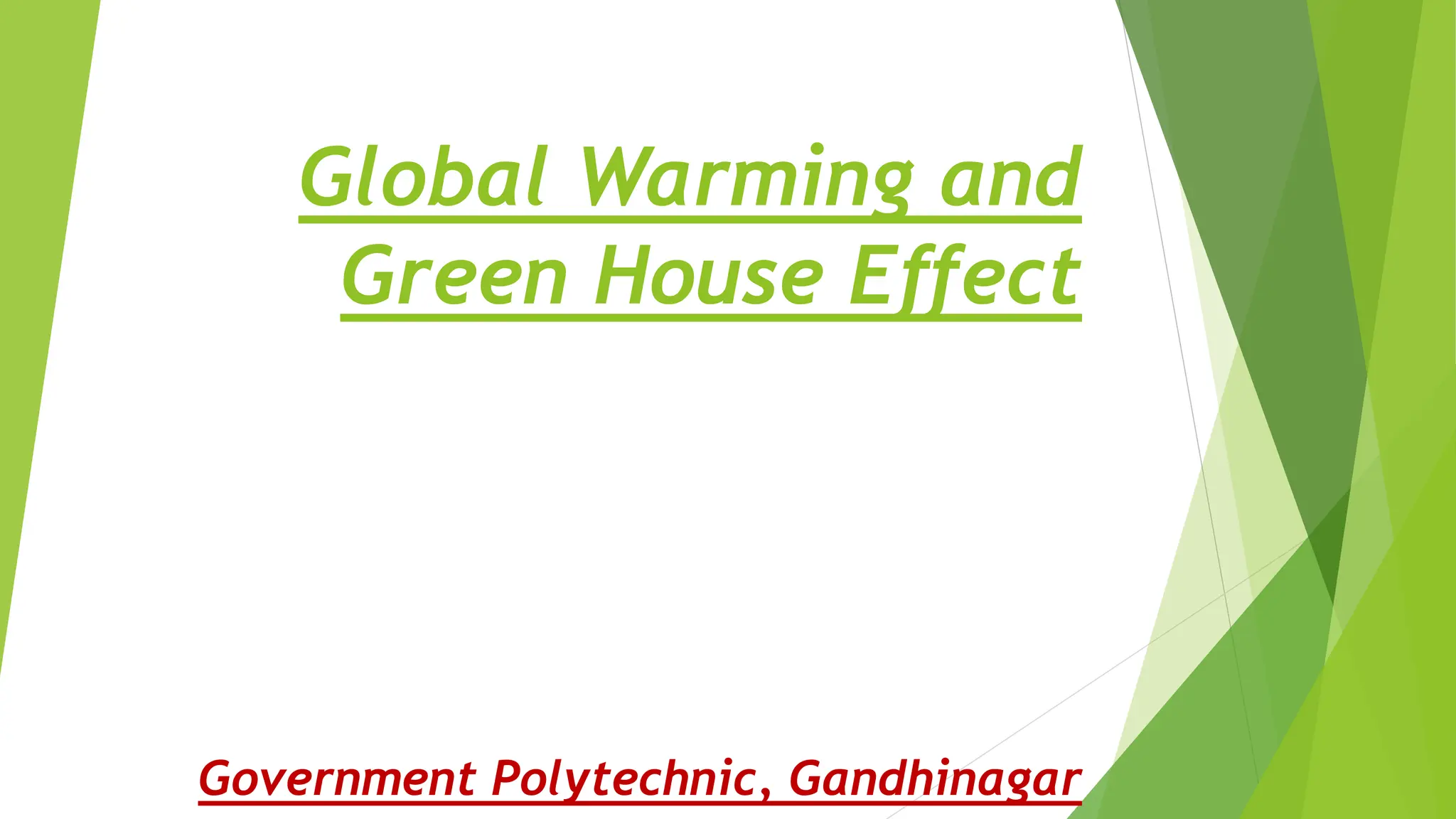 This document discusses global warming and the greenhouse effect. It defines key terms like climate change, global warming, and greenhouse gases. Climate change refers to trends in the earth's climate like rising average temperatures. Global warming is the increase in the earth's average temperature causing climate pattern changes globally. Greenhouse gases like carbon dioxide and methane are absorbed by the atmosphere and cause the greenhouse effect by trapping heat. The document then lists major causes of global warming and the greenhouse effect like burning fossil fuels, deforestation, farming, industrial waste, and air pollution. Solutions provided to address global warming include reducing waste and energy usage, conserving water, and recycling.