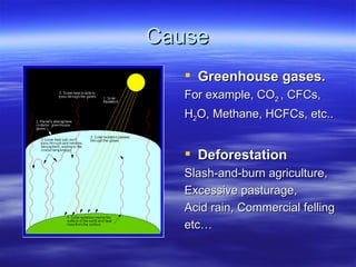 Global warming is caused by greenhouse gases such as carbon dioxide, CFCs, methane and HCFCs released from activities like deforestation, agriculture, and industrialization. This leads to extreme weather, rising sea levels as ice caps melt, ecosystem damage like coral bleaching and extinction, and problems like desertification and infectious diseases. Individual actions like using less energy, traveling efficiently, afforestation, and conserving resources can help address the climate crisis.