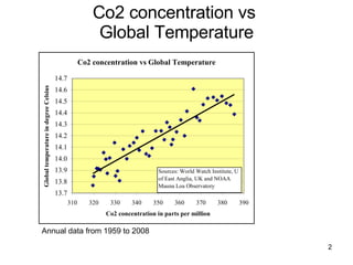 The document discusses a regression model developed to predict global temperatures based on CO2 concentrations from 1959 to 2003, which performed well against IPCC scenarios. However, it underperformed in a hold-out period from 2004 to 2008, suggesting that current temperature trends may indicate a lower impact of CO2 on temperature than the IPCC predicts. The document raises questions about the realism of IPCC's CO2 growth rate forecasts compared to historical data.