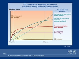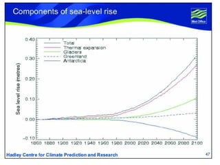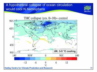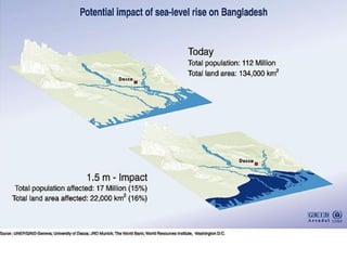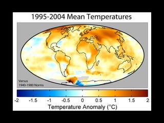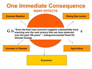 Global warming will have significant negative effects on human health, agriculture, and the global economy according to the document. It is estimated to already cause over 150,000 deaths per year and will exacerbate problems like infectious diseases, heat waves, droughts, and natural disasters. Agriculture will be impacted through changes in precipitation patterns and rising temperatures, which could put hundreds of millions of additional people at risk of hunger by 2060. The economic costs of climate change include damage from increased natural disasters, loss of coastal lands, and declines in productivity, with some estimates indicating costs of 5-20% of global GDP if no action is taken.