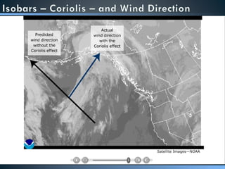 The document discusses global wind patterns that develop due to temperature differences between the equator and poles. Warm air rises at the equator, creating low pressure, while cold air sinks at the poles, creating high pressure. Air moves from high to low pressure areas, resulting in global wind currents called the prevailing westerlies, easterly trade winds, and polar easterlies in both hemispheres. The Coriolis effect causes these winds to curve right in the northern hemisphere and left in the southern hemisphere as they travel.
