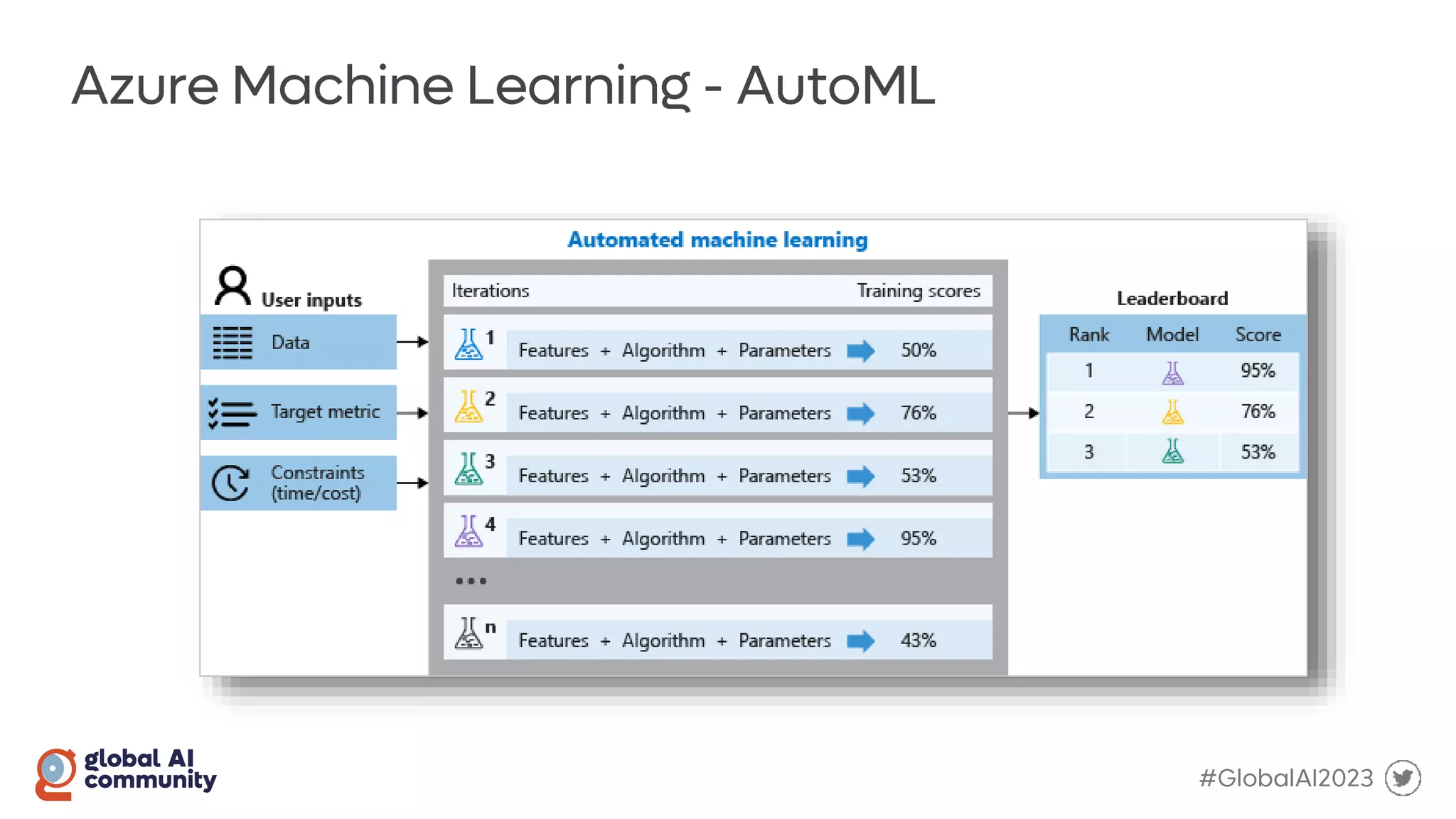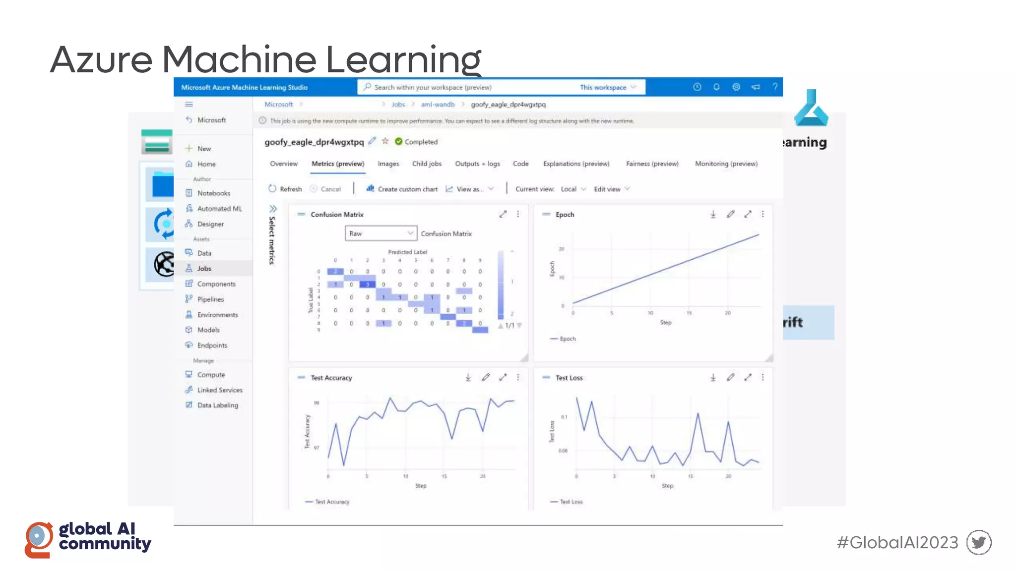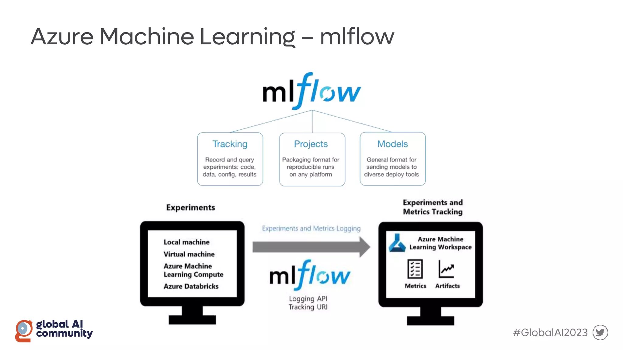 The document discusses the Global AI Bootcamp which will take place from March 2nd to 4th 2023. It outlines the typical machine learning workflow including data ingestion, data cleansing, model training and building, model testing, and model deployment. It also mentions using Azure Machine Learning for the model registry and train/test loops, with feedback loops and the Python SDK. Precision and AUC are also briefly discussed.