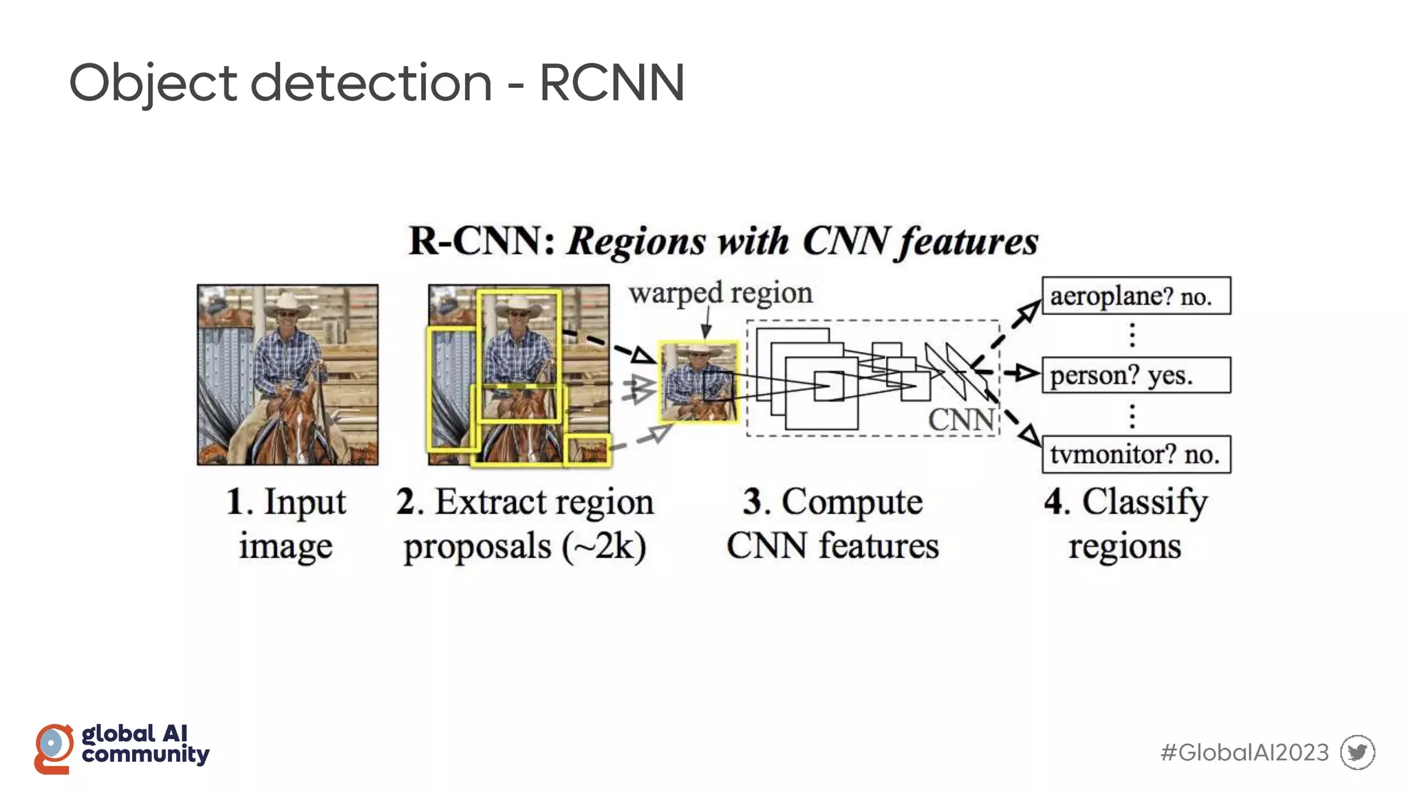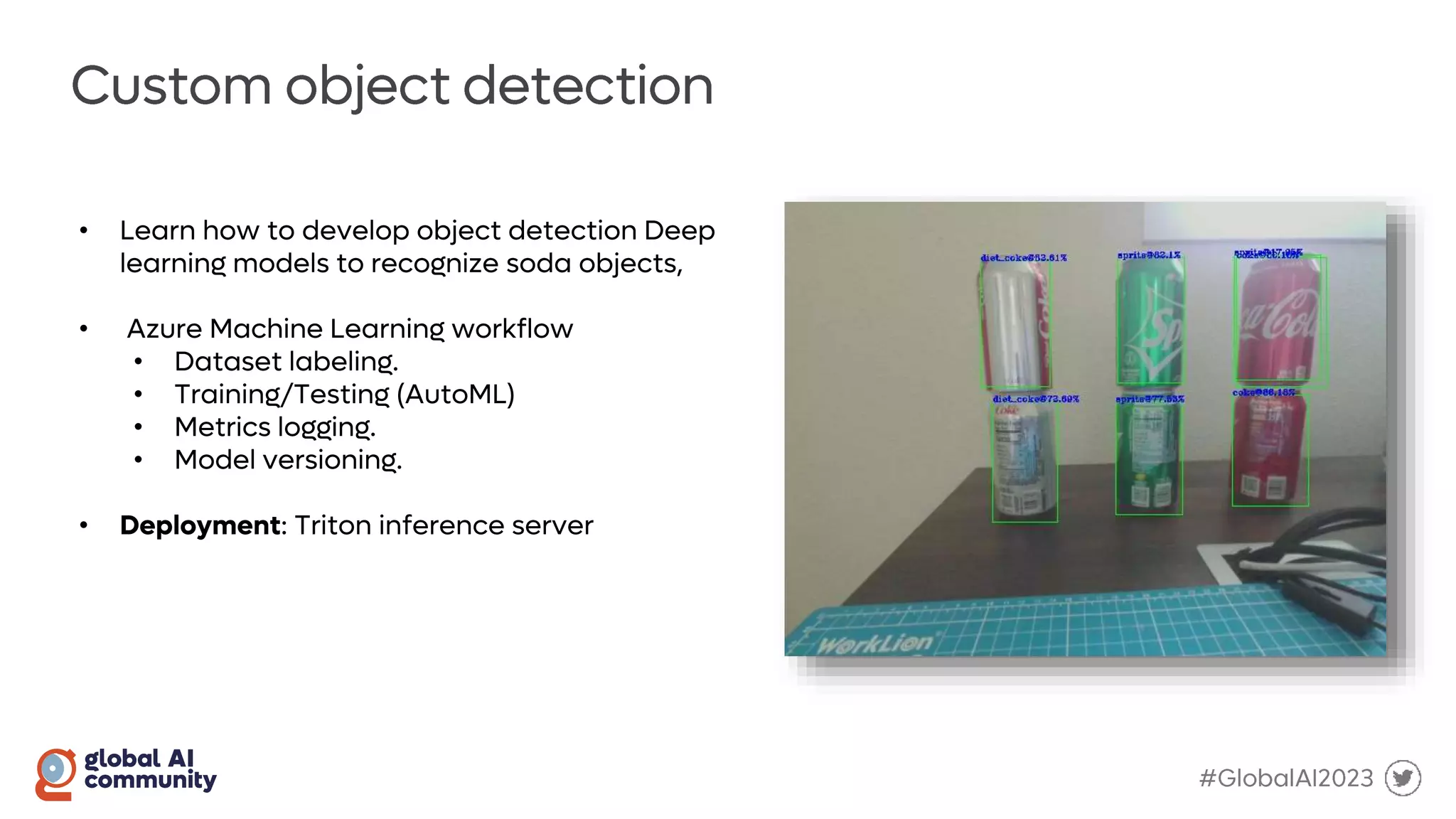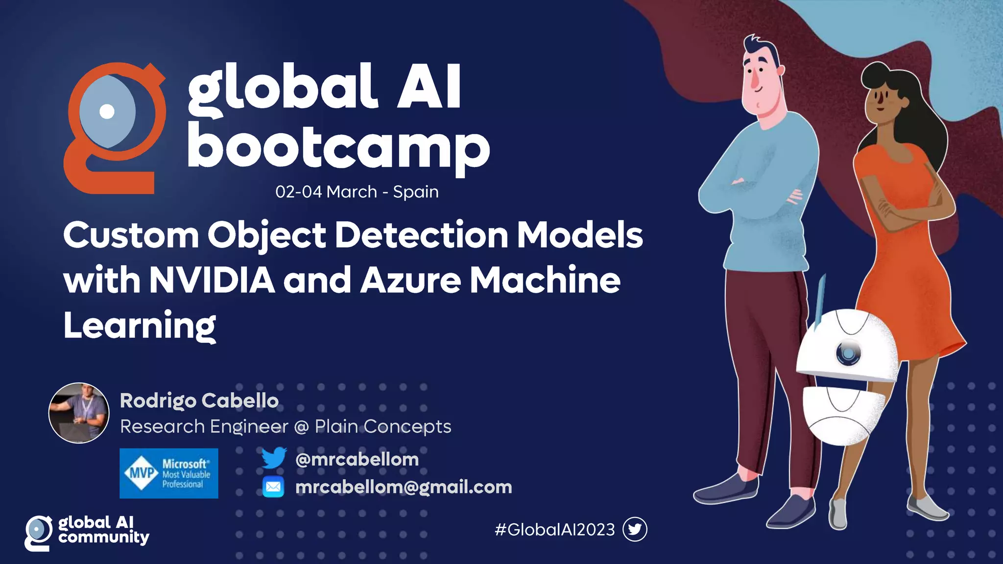 The document discusses the Global AI Bootcamp which will take place from March 2nd to 4th 2023. It outlines the typical machine learning workflow including data ingestion, data cleansing, model training and building, model testing, and model deployment. It also mentions using Azure Machine Learning for the model registry and train/test loops, with feedback loops and the Python SDK. Precision and AUC are also briefly discussed.
