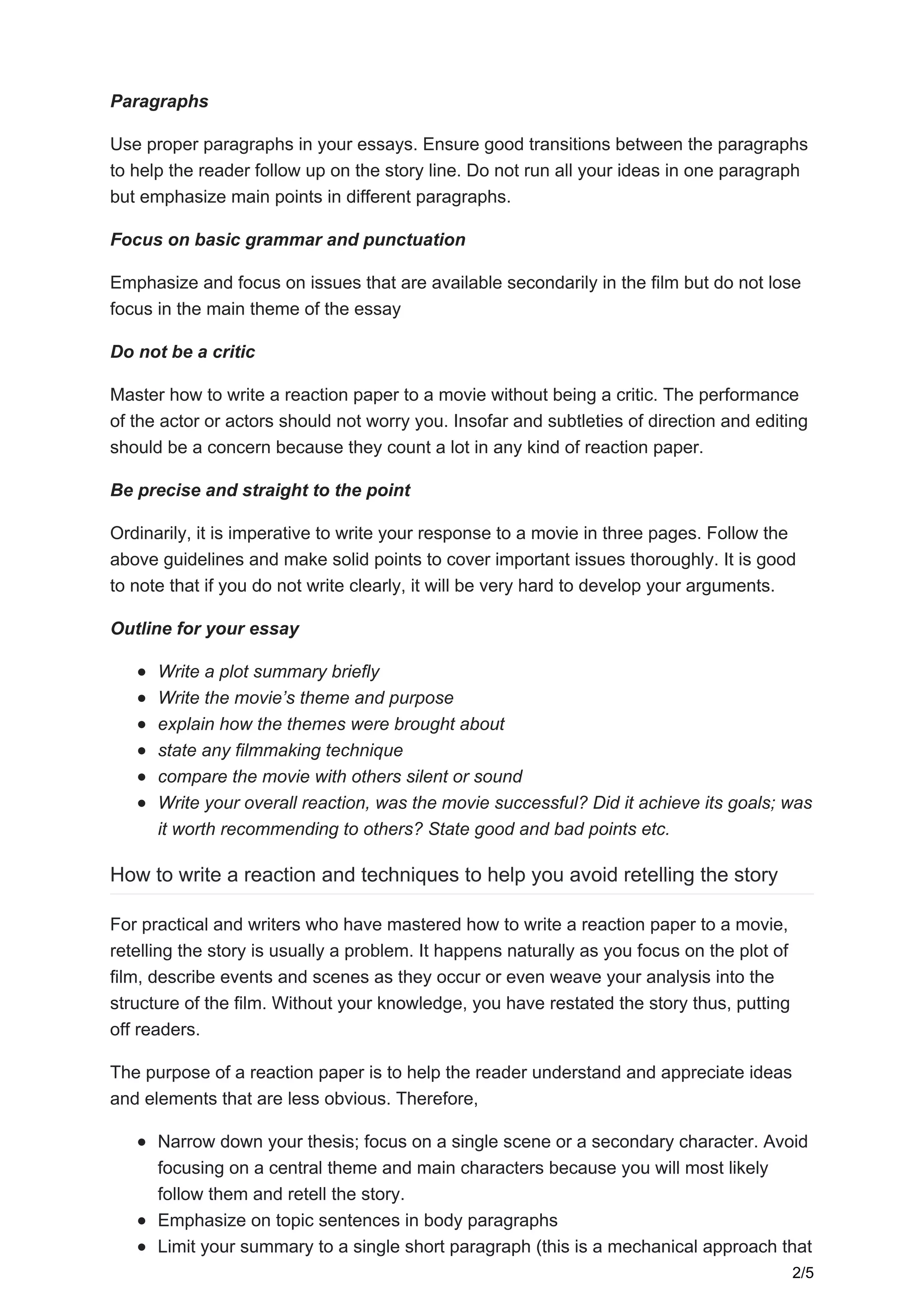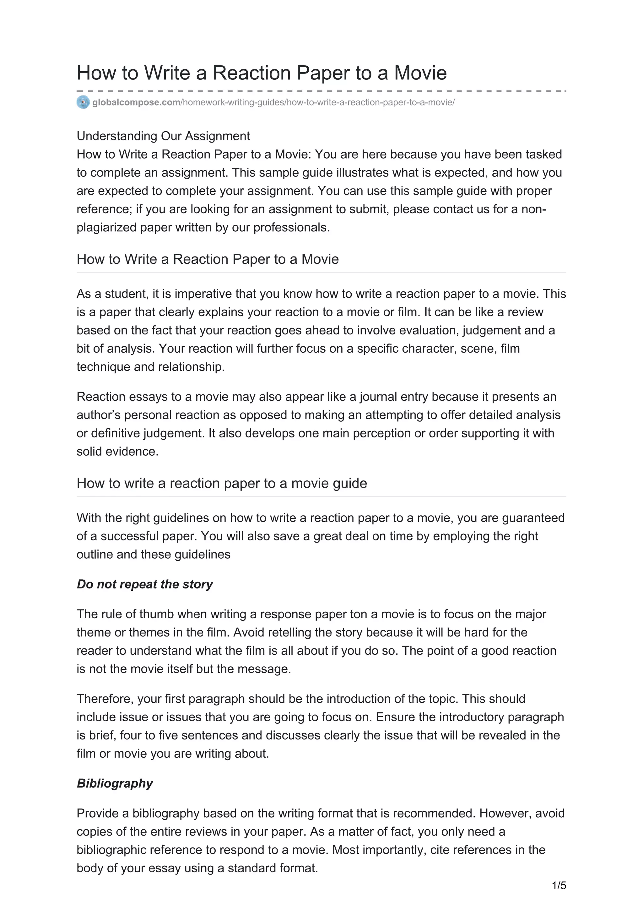 This document provides guidance on how to write a reaction paper to a movie. It begins by explaining that a reaction paper expresses a personal reaction and analysis of a movie rather than providing detailed analysis or judgment. It then outlines the key elements of a successful reaction paper, including focusing on themes rather than retelling the story, using proper paragraphs and grammar, and providing a three-page outline focusing on plot, themes, techniques, and an overall reaction. The document also provides examples of reaction papers and references for further assistance.