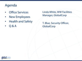 This training covers facilities management at GlobalCorp, including office services, new employee onboarding, and health and safety. Office services include reception duties, mail handling, meeting room scheduling, and office cleaning. When onboarding new employees, facilities ensures workstations are set up and arranges for office equipment, furniture, and business travel. Health and safety topics include office security, maintenance of security systems, and administering the emergency response plan. The training concludes with a Q&A session.