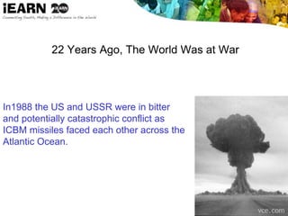 The document discusses how global education and technology can help create a culture of peace. It provides examples of how students in the 1980s used early technologies and online projects to connect across borders and conflicts. Global education aims to increase awareness of other cultures, commitment to respecting differences, and engagement in collaborative actions. The document outlines specific past and present iEARN projects that help students develop these skills and work together internationally on issues like the environment, migration, and cultural exchange. It calls for connecting all US schools to global education opportunities by 2016 to give students skills for addressing global problems.