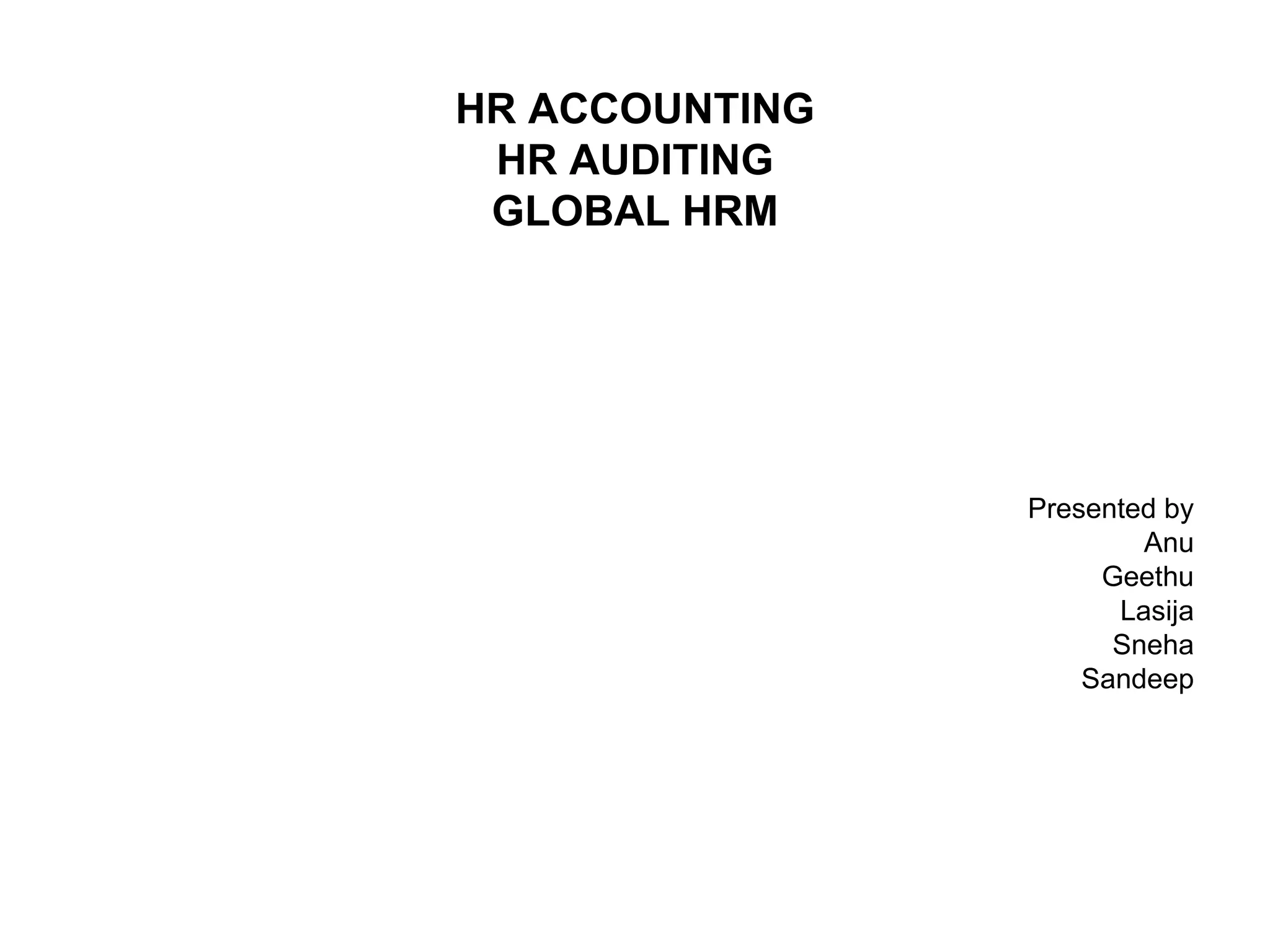 This document provides an overview of human resource accounting, auditing, and global human resource management. It discusses measuring the value of human resources, objectives of HR accounting and auditing, advantages and limitations of HR accounting, purposes and objectives of HR audits, skills needed for global managers, and challenges in global HRM including staffing, training, and performance management across cultures.