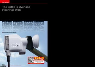 Global Invacom has developed a fibre optic distribution system for satellite signals that overcomes the limitations of traditional coaxial cable systems. The system uses an innovative FibreIRS LNBm that stacks multiple satellite bands and polarizations into a single combined signal output. This signal is then converted to light and transmitted over fibre optic cables with minimal loss. TELE-satellite tested the full system and found that it was able to deliver satellite signals to receivers with similar quality to traditional coaxial systems, even over 300 meters of cable and through two optical splitters. The fibre optic system allows for easily building very large distribution networks without concerns about signal attenuation.