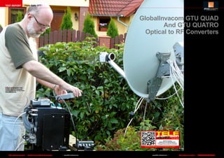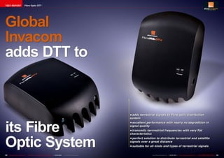 GlobalInvacom adds terrestrial TV (DTT) signals to its fibre optic distribution system using new optical-to-RF converters. Testing showed the GTU converters transmitted DTT signals with nearly no degradation in signal quality over fibre. Both the QUAD GTU and QUATRO GTU performed excellently, maintaining high signal power and quality even when transmitting satellite and terrestrial signals simultaneously over long distances.