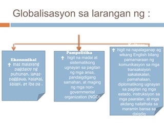 Tinalakay sa dokumento ang mga kasalukuyang isyu at suliranin na dulot ng globalisasyon, kabilang ang mga pagbabago sa ekonomiya, kultura, at politika. Binanggit ang positibong epekto ng globalisasyon tulad ng paglikha ng mga trabaho at mas murang produkto, ngunit tinukoy din ang negatibong aspeto nito, kabilang ang paglala ng agwat ng yaman sa pagitan ng mga bansa. Tinalakay din ang papel ng World Trade Organization sa pagsusulong ng malayang kalakalan at ang mga banta ng globalisasyon sa kapangyarihan ng mga bansa, lalo na ang impluwensya ng mga transnational corporation.