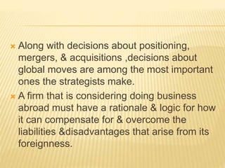 The document discusses globalization, highlighting its impact on business strategies, economic interdependence, and the benefits and drawbacks faced by different populations. It outlines the importance of understanding various factors such as political, economic, social, and technological conditions when companies consider entering foreign markets. Additionally, it explains market entry methods, strategies for adapting marketing mixes to local markets, and the difference between competing internationally versus globally.