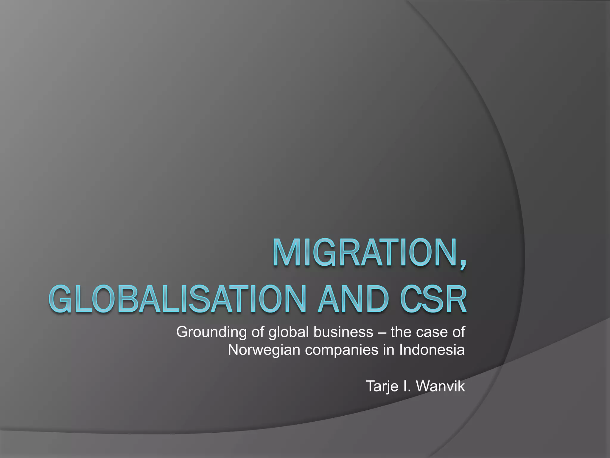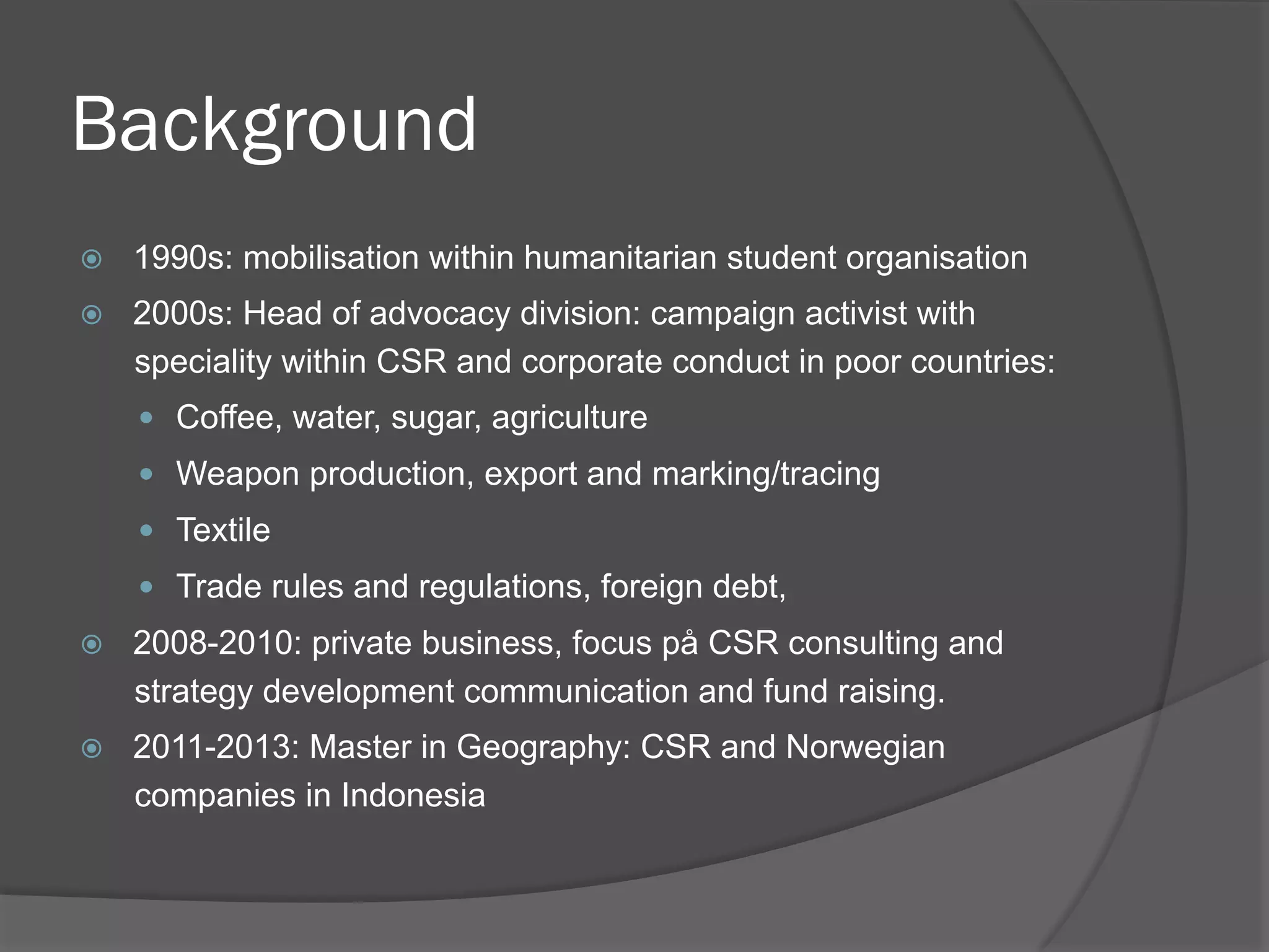 This document provides background on a research project studying how corporate social responsibility (CSR) can help ground foreign companies in local communities in Indonesia. It discusses the researcher's background in activism, consulting, and research related to CSR. It outlines the research questions and methodology, which includes analyzing CSR laws and practices of nine Norwegian companies through document review and interviews. The document also discusses theories of place, globalization, networks, power, stakeholders, and CSR. It analyzes companies' CSR activities, motivations, stakeholders, and stakeholder management strategies. It discusses external forces that can attach or detach companies from local communities and the internal strategies companies use in response.