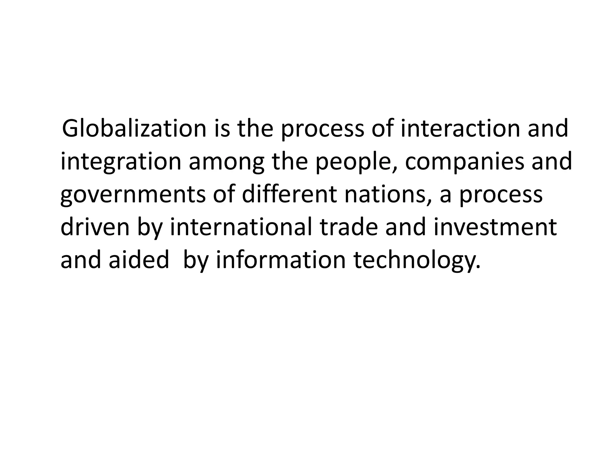 Globalization is the increasing integration and interaction between people, companies, and governments of different nations, driven by international trade and investment and aided by information technology. It involves the movement of goods, services, capital, people, technology, and ideas across national borders. Key drivers of globalization include developments in transportation and communication technologies as well as the growth of transnational corporations that operate in multiple countries. While globalization has increased economic growth and cultural awareness, it has also widened income inequality and threatened some local cultures and environments.