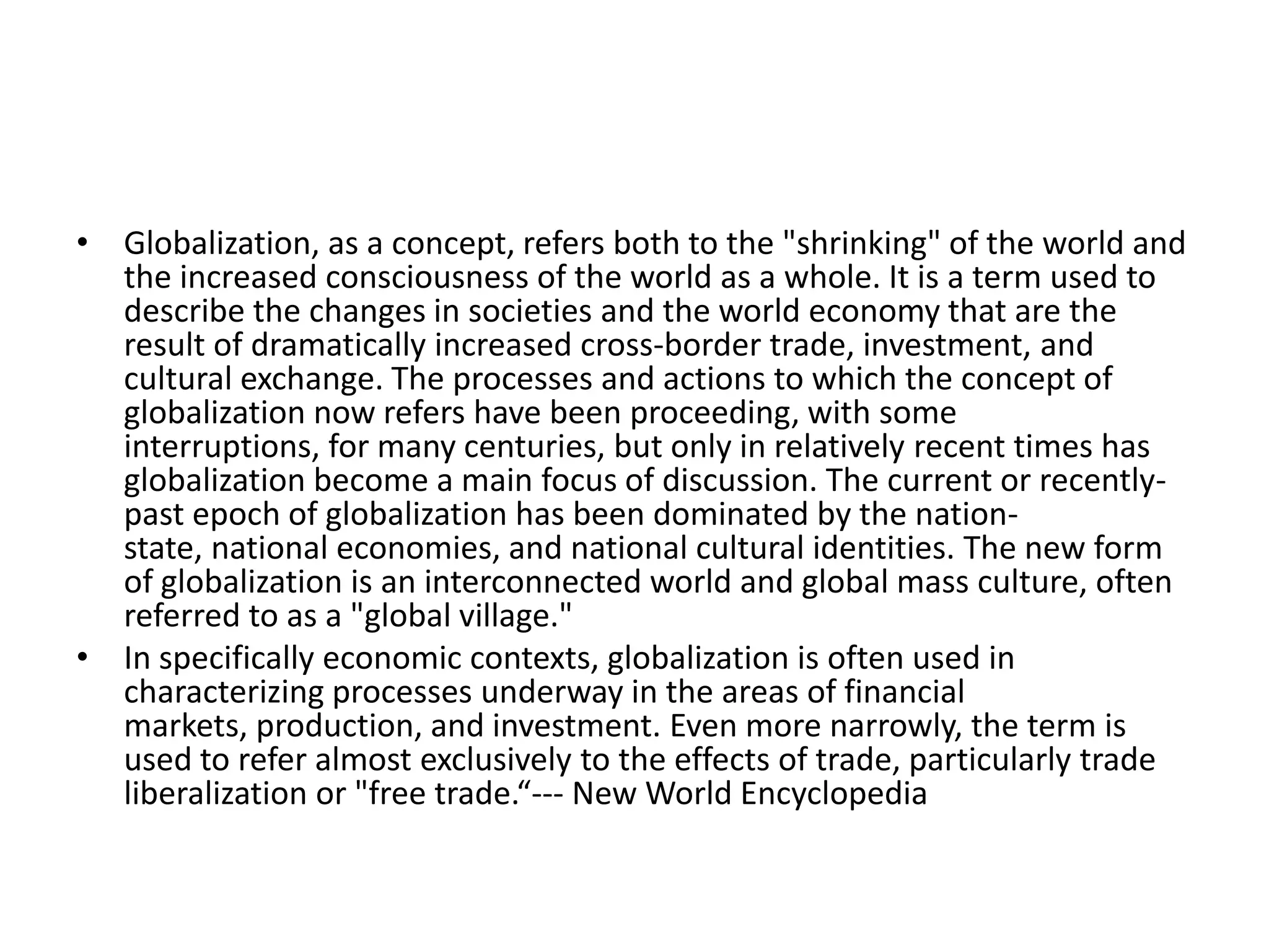 Globalization refers to the increasing interconnectedness between societies and economies around the world through cross-border trade, investment and cultural exchange. While globalization has been ongoing for centuries, it has accelerated in recent decades due to advances in technology and transportation. Supporters argue that globalization increases economic growth and benefits all participants, while critics argue it exacerbates inequality and undermines local cultures and economies. There is ongoing debate around how to ensure the benefits of globalization are distributed equitably and its impacts are properly managed.
