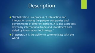 Globalization is defined as the integration and interaction of people, companies, and governments around the world, driven by international trade, investment, and technology. Globalization affects many aspects of the economy and provides connectivity worldwide. It is important because it forces businesses to compete globally and allows people to communicate and spread ideas across borders. In education, globalization has increased international student enrollment, introduced multicultural perspectives, and sparked interest in study abroad programs to prepare students for an interconnected world.