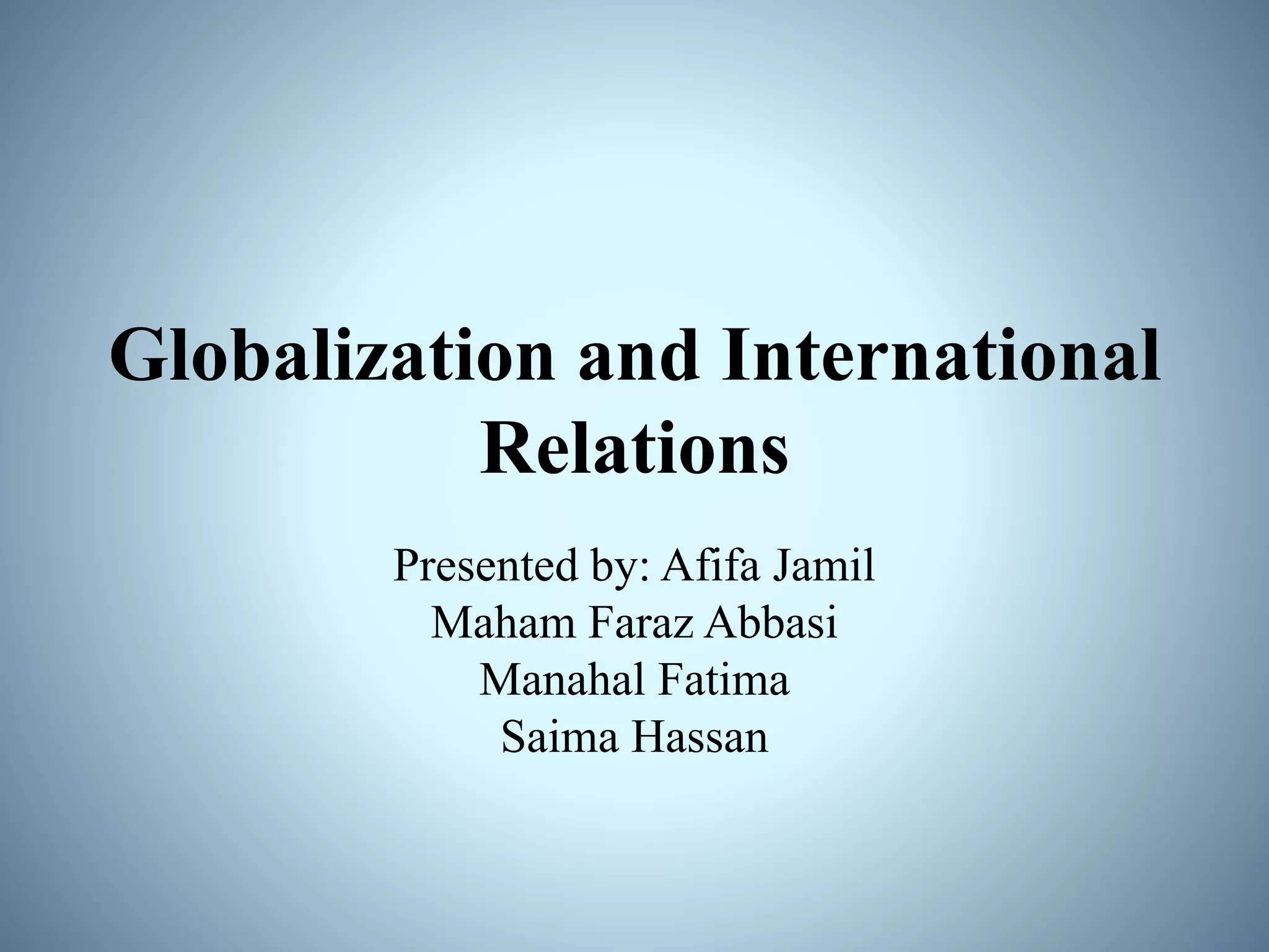 This document discusses different aspects of globalization and how they relate to international relations. It begins by defining globalization and cultural, social, economic, and political globalization. For each type of globalization, it provides examples and discusses both the positive and negative impacts. Specifically, it examines how globalization has influenced families, religion, and education through social globalization. It also analyzes the effects of economic globalization on developing countries. Finally, it discusses the rise of political globalization through international organizations and nongovernmental groups, and how this impacts governance on local, regional, and global levels.